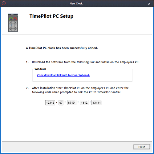 Start the newly installed TimePilot PC and enter the registration number displayed in the previous step. Note: You can also retrieve this registration number after you click "Finish" by right-clicking on the TimePilot PC's icon in Clock Manager and selecting Properties.