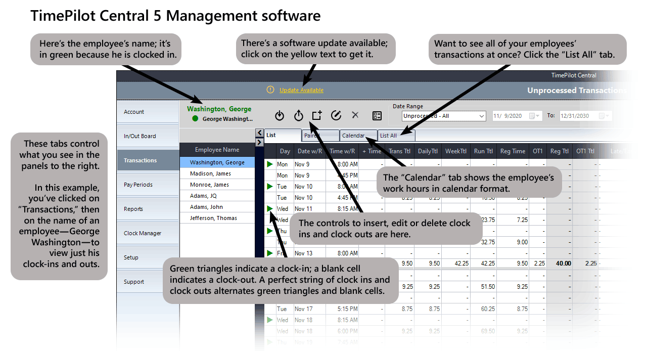 In the TimePilot 5 management software, supervisors can edit or insert clock-ins and clock-outs, create reports by employee, department or location, or export the data to a spreadsheet or to a payroll service or software package like QuickBooks.